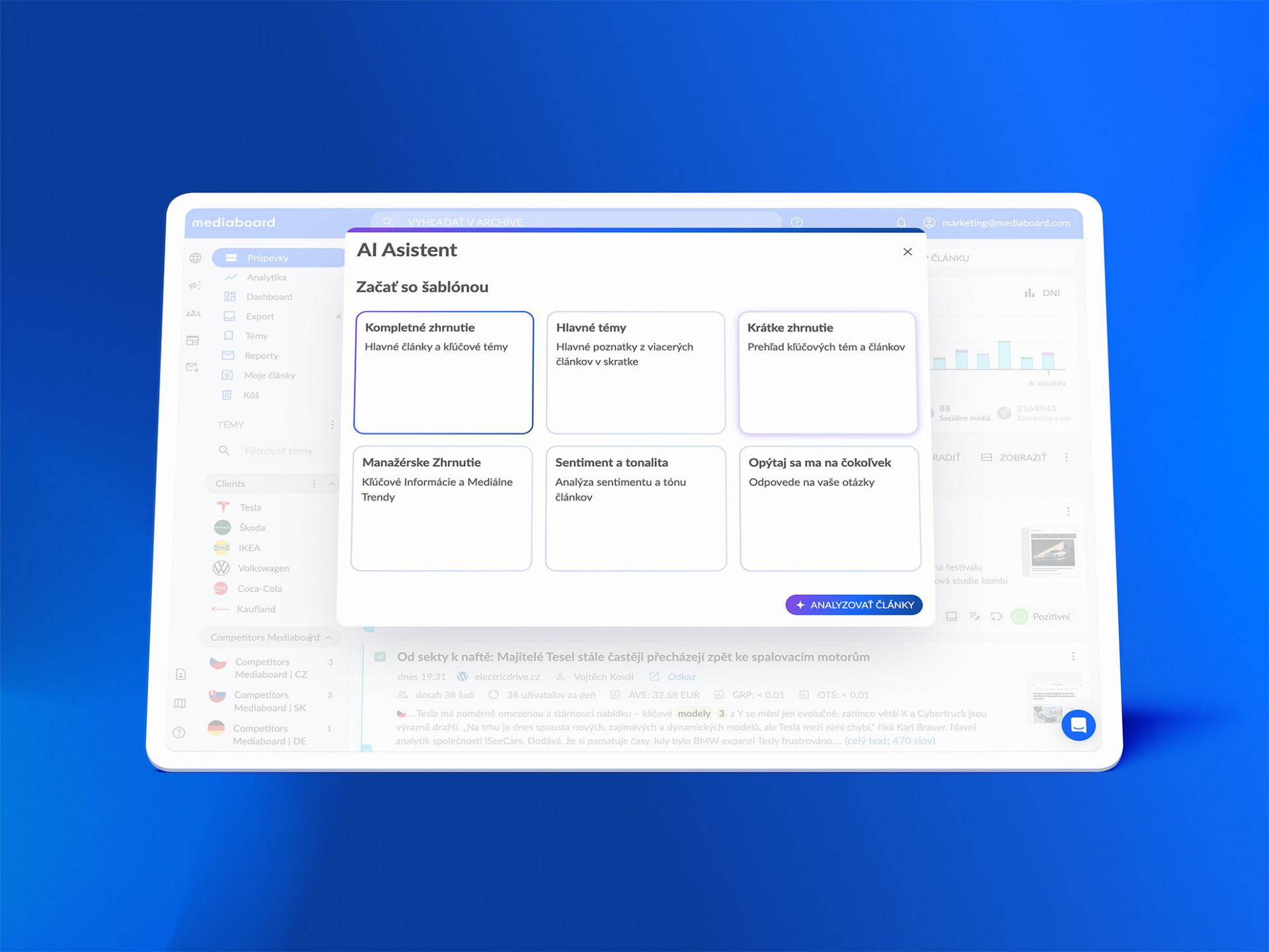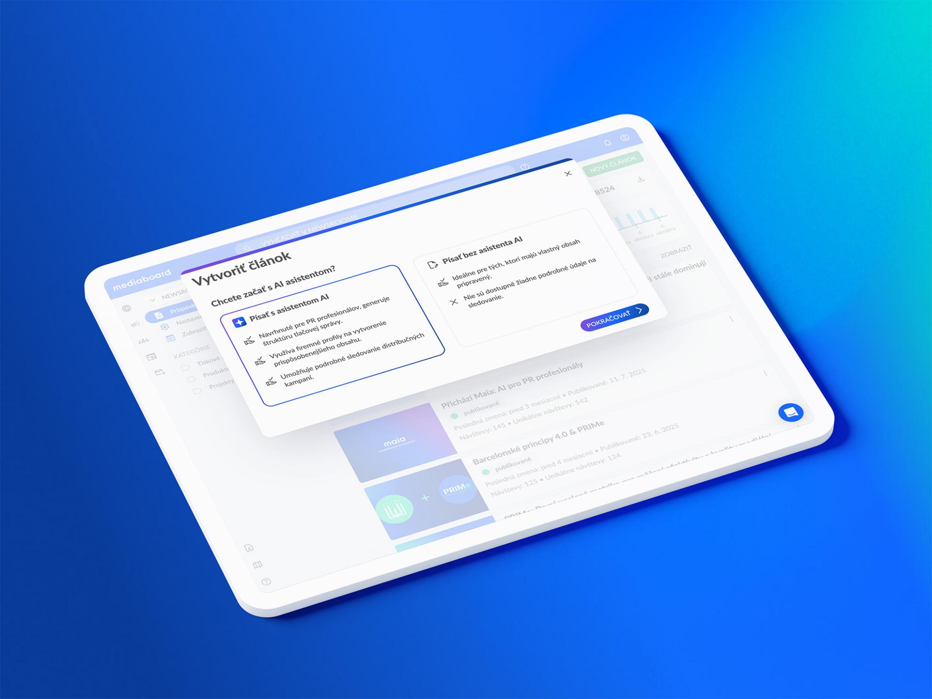 Spoločnosti tak získajú najkomplexnejší a strategicky cenný pohľad na svoj mediálny obraz. Odpadá zdĺhavá manuálna analýza monitoringu, ručné prechádzanie článkov a hľadanie súvislostí podstatných pre značku. „MAIA sa prispôsobí značke a firemnému kontextu a pripraví relevantné zhrnutie, s ktorým sa dá okamžite pracovať, napríklad zdieľať s vedením,“ hovorí Šimášek.AI asistent nadväzuje na funkcie umelej inteligencie, ktoré spoločnosť poskytuje v rámci svojej platformy Mediaboard Connect. AI pomôže napríklad s kompletným návrhom tlačových správ na základe vstupov, kontrolou podkladov alebo prekladom. Vďaka využitiu vlastných promptov navyše zachováva definovaný tone of voice značky. Umožňuje aj využitie pripravených šablón a v rámci sekcie E-mailing vytvorí personalizované e-maily a zabezpečí automatizované rozposielanie správ z Newsroomu spolu s analýzou.