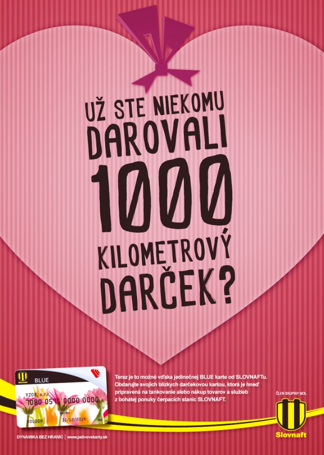 Cieľom je odkomunikovať darčekovú Blue kartu, ktorú je možné využiť na tankovanie motorových palív alebo nákup produktov a služieb na čerpacích staníciach SLOVNAFT. Vizuál s headlineom: „Už ste niekomu darovali 1000-kilometrový darček?“ bol nasadený do printových médií, na čerpacie stanice SLOVNAFT a tiež ako online banner.