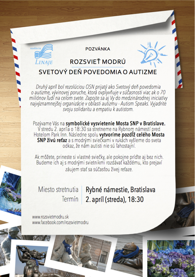 Modré aktivity súvisia s celosvetovou kampaňou z iniciatívy americkej organizácie Autism Speaks Rozsvieť modrú (Light It Up Blue), ku ktorej sa na Slovensku pripája aj Nadácia Linaje. Aktivity vyvrcholia dnes, kedy okrem „vymodrenia“ významných stavieb Most SNP zaplní živá reťaz z ľudí s modrými kahancami. Nebude chýbať ani modrý ohňostroj na Bratislavskom hrade. Práve tento dátum Organizácia Spojených Národov vyhlásila v roku 2007 za Svetový deň povedomia o autizme.