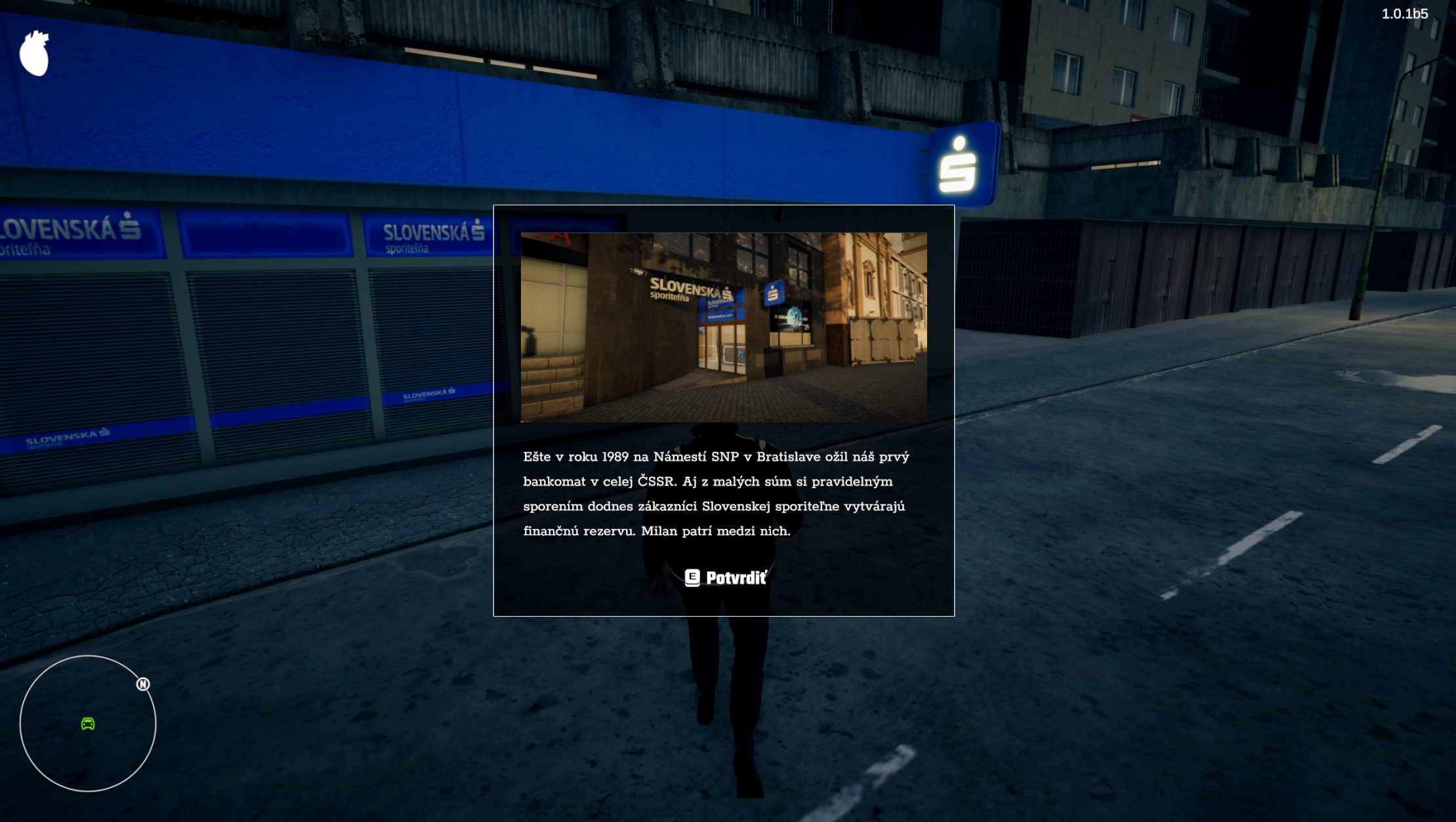 V prvej slovenskej GTA hre môžete naraziť aj na tento oznam: „V roku 1989 na Námestí SNP v Bratislave ožil prvý bankomat Slovenskej sporiteľne v celej ČSSR. Aj z malých súm si pravidelným sporením dodnes klienti Slovenskej sporiteľne vytvárajú finančnú rezervu. Milan patrí medzi nich.“ Oznam o prvom bankomate sa objaví hráčom, keď si prídu do pobočky Slovenskej sporiteľne na námestí SNP vybrať úroky zo zarobených a nasporených peňazí. Hlavnou postavou hry je taxikár a zároveň tajný agent Milan, ktorý sleduje podsvetie Bratislavy plnej korupcie, slabých inštitúcií a politických machinácií v divokých 90. rokoch na Slovensku.