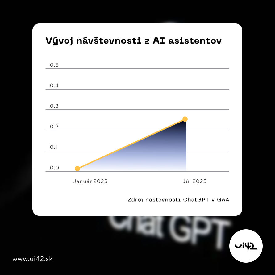 Na základe prieskumu, ktorý sme v ui42 realizovali na reprezentatívnej vzorke tvorenej z 80 e-shopov – od malých lokálnych predajcov až po veľké eshopy s miliónovými obratmi – sa jasne ukazuje, že AI asistenti začínajú zohrávať významnejšiu úlohu ako zdroj návštev, a teda pri získavaní zákazníkov.