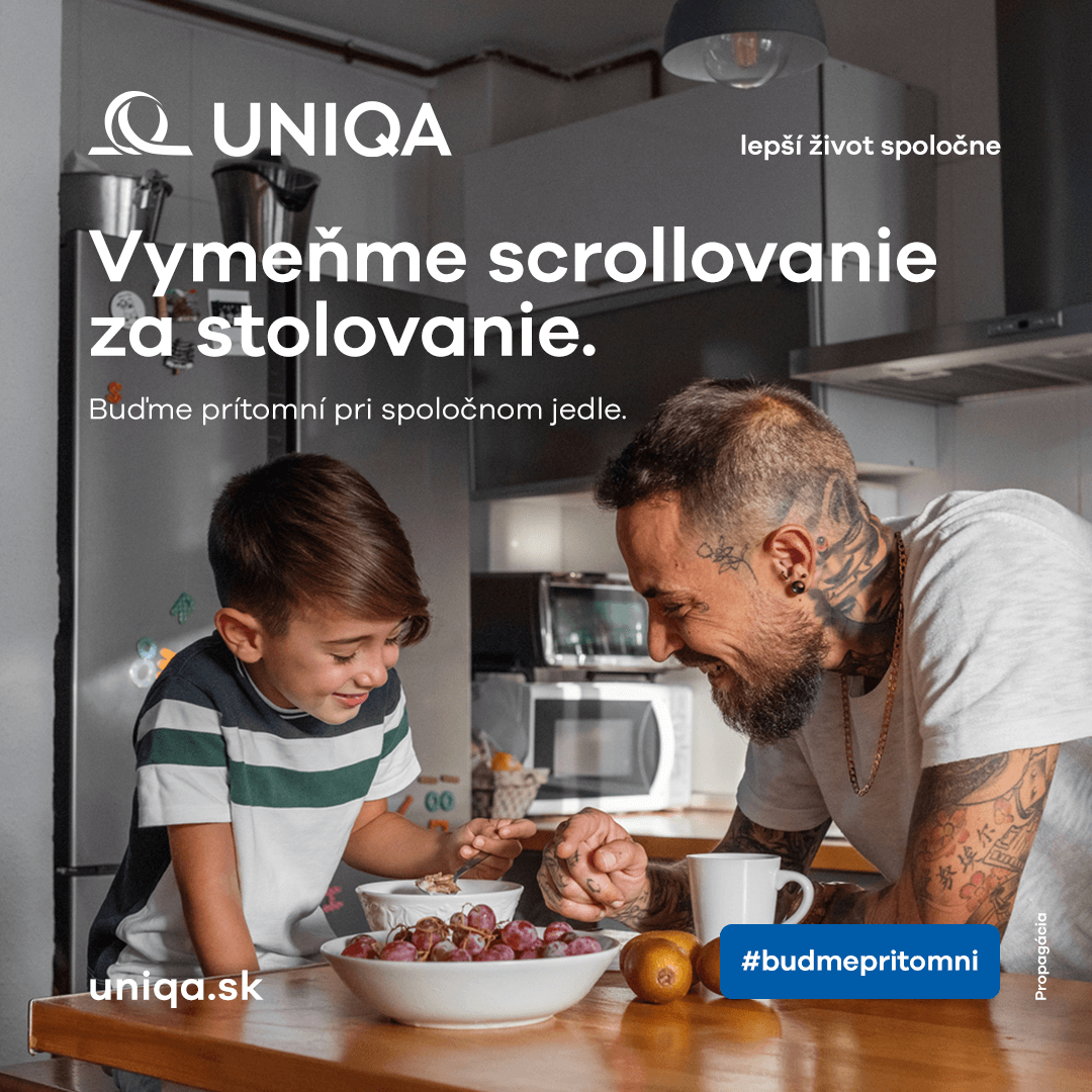 Ruku na srdce. Kedy ste naposledy ako rodina spoločne jedli za jedným stolom? A aké konverzácie ste pritom viedli s vašimi najbližšími? Po jednoslovných odpovediach na otázky „čo bolo v škole?” resp. „aký si mal/a deň?” ostane väčšinou ticho. „Snažili sme sa vytvoriť niečo, čo nebude len poukazovať na problém, ale aktívne ho riešiť. Preto sme vytvorili jedálenský obrus posiaty desiatkami otvorených otázok, ktoré nás podnecujú k spoločnej diskusii. Chceme, aby boli rodiny čo najviac prítomné,” hovorí Jakub Drobec, riaditeľ pre značku, marketing a komunikáciu UNIQA.