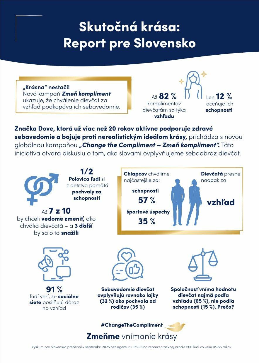 Značka Dove, ktorá už viac než 20 rokov aktívne podporuje zdravé sebavedomie a bojuje proti nerealistickým ideálom krásy, prichádza s novou globálnou kampaňou „Change the Compliment – Zmeň kompliment“. Táto iniciatíva otvára diskusiu o tom, ako slovami ovplyvňujeme sebaobraz dievčat – a prečo je čas prestať ich hodnotiť len cez vzhľad. Až 82 % komplimentov dievčatám sa totiž týka ich vzhľadu. Kampaň vyzýva na zmenu – je čas chváliť za schopnosti a odvahu.