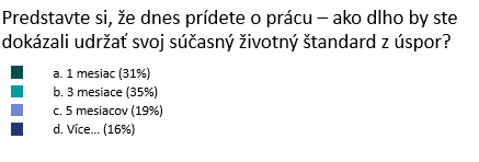 Tretina mladých ľudí by si v prípade straty príjmu dokázala finančne udržať životný štandard len jeden mesiac. Ďalších 35 percent by vedelo bez príjmu zafinancovať z úspor trojmesačné výdavky. Spolu by teda dve tretiny mladých zvládli bez ťažkostí prežiť z úspor maximálne štvrť roka. „Finančná rezerva vo výške troch až šiestich mesačných výdavkov je základom finančnej stability. Žiaľ, vidíme, že väčšina mladých ľudí takúto rezervu nemá. Odporúčame začať si odkladať aj menšie sumy pravidelne – kľúčová je pravidelnosť, nie výška sumy,“ radí Vladimír Holovka.
