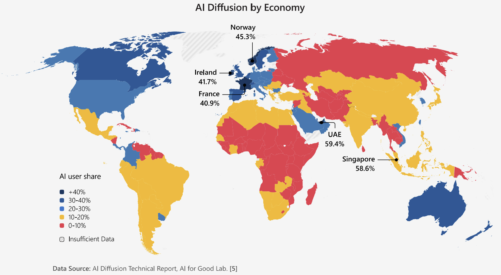 Report AI Diffusion ďalej poukazuje na rýchlosť šírenia umelej inteligencie. AI dosiahla viac ako miliardu používateľov za menej ako tri roky, čo je rýchlejšie než sa kedysi šíril internet, smartfóny či sociálne siete.
