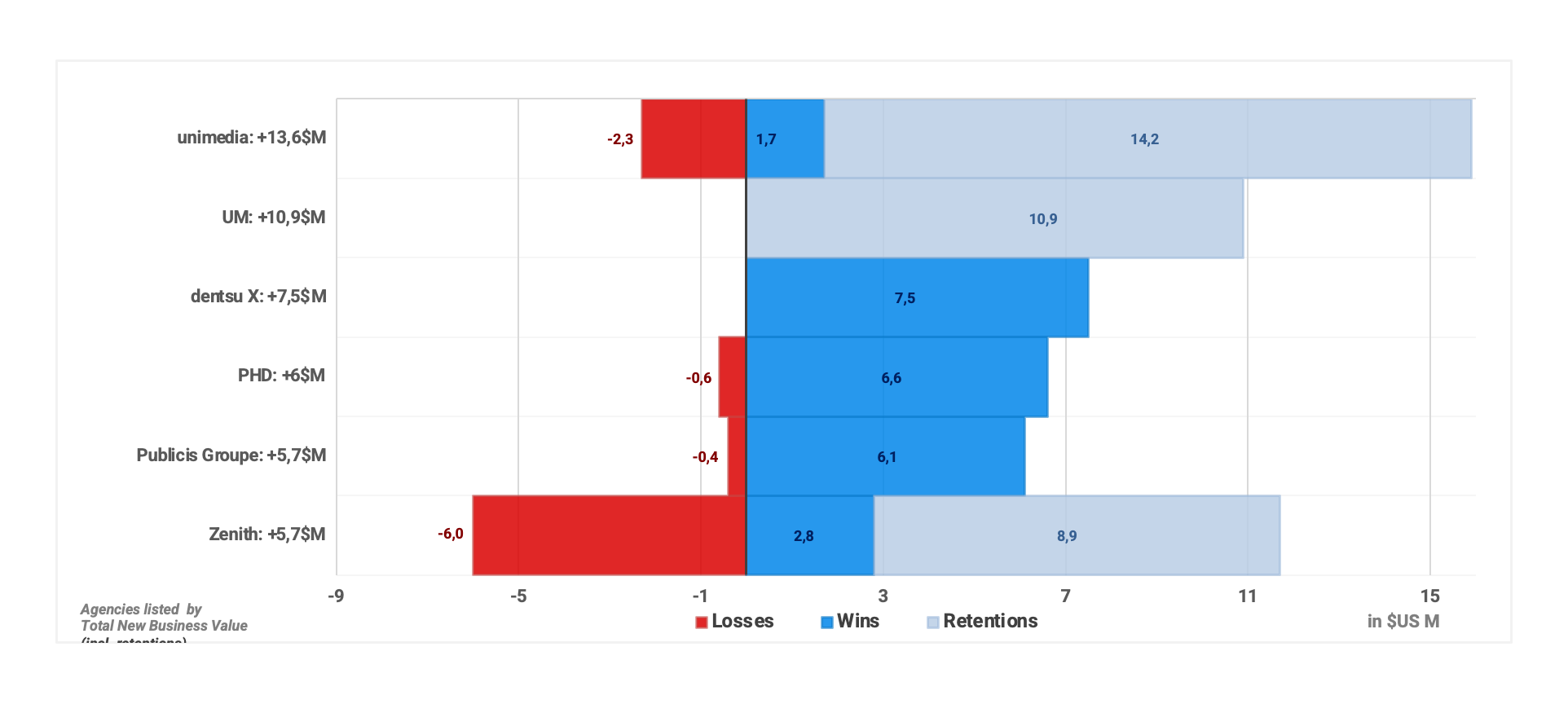Unimedia vynikla udržaním si klienta Alza. UM k dobrým výsledkom pomohlo udržanie si značky Reckitt. Výsledky Dentsu X výrazne ovplyvnil zisk značky Tipsport.