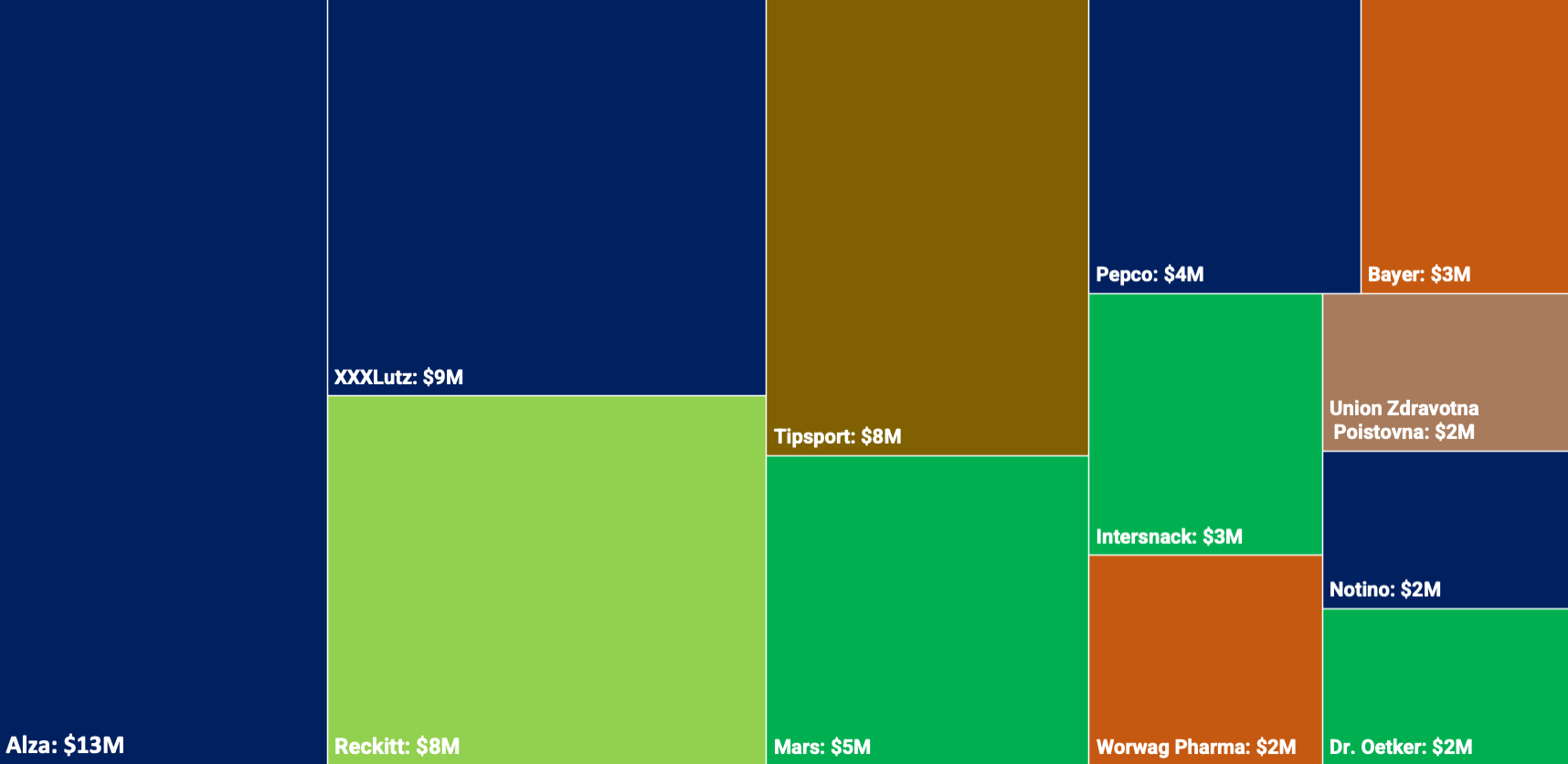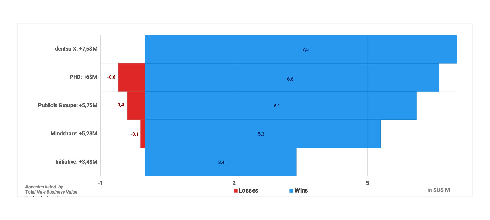 Dentsu obsadilo tretie miesto vďaka dvom veľkým výhram nových klientov – Tipsport a Wolt, s rozpočtami 7,5 mil. USD a 1,4 mil. USD.