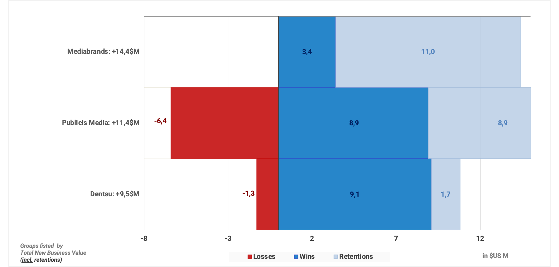 Na úrovni skupín vedie rebríček celkovej hodnoty nového biznisu za obdobie Q1–Q3 2025 (vrátane retencií) Mediabrands. Výsledky skupiny boli podporené významnými retenciami klientov Reckitt (8,2 mil. USD) a Worwag Pharma (2,5 mil. USD), ako aj získaním klienta Bayer (3,2 mil. USD).