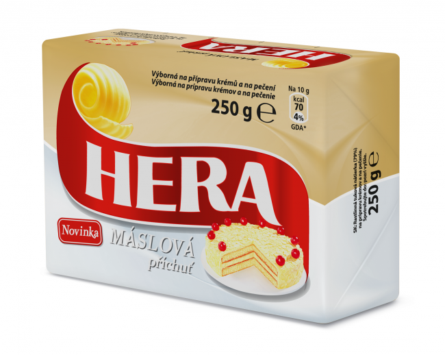 Hera je brand s 85-ročnou tradíciou a imidžom experta na pečenie. "Na základe pozitívnej skúsenosti a tradícií predstavujeme novú Heru - maslová príchuť, ktorá je vytvorená kombináciou kvalitného rastlinného oleja a maslovej príchute. Vďaka tomu je výborná do koláčov a krémov, ľahko sa zapracováva do cesta, drží tvar cesta a prináša vynikajúcu chuť. Vo všetkých obchodných reťazcoch ju nájdete v priebehu najbližších dní,"dopĺňa Renáta Uhrínová.