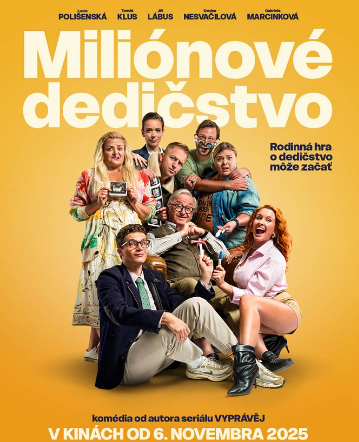 Počas spoločnej večere preto vyhlási zvláštnu súťaž. Milión eur získa to z jeho detí a vnúčat, ktorému sa ako prvému z nich narodí potomok. Najprv si všetci myslia, že sa zbláznil. Kde by na to vzal? No keď sa dozvedia, že predal milovaný rodinný majetok a skutočne má milión eur v hotovosti, nálada sa razom mení. A rodinná súťaž o peniaze sa môže začať... Hviezdne obsadenieV komédii Miliónové dedičstvo sa predstaví plejáda známych mien: JiříLábus, Tomáš Klus, Lucie Polišenská, Gabriela Marcinková, Erika Stárková, Marek Holý, Denisa Nesvačilová a Daniel Krejčík. Legendárny Jiří Lábus si úlohu hlavy rodiny naplno užil. Verí, že film prinesie divákom nielen smiech, ale aj dobrú náladu: