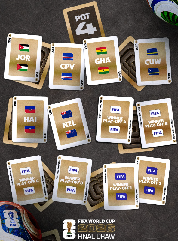 Kôš 4: Jordánsko, Kapverdy, Ghana, Curacao, Haiti, Nový Zéland, štyria víťazi európskej baráže (potenciálne Slovensko), dvaja víťazi interkontinentálnej baráže