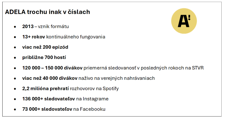 Po viac než trinástich rokoch vysielania vstupuje jeden z najdlhšie fungujúcich rozhovorových formátov na Slovensku do novej etapy. Trochu inak s Adelou pokračuje ďalej pod novým názvom ADELA trochu inak a po odchode z verejnoprávneho prostredia začína fungovať ako nezávislý online projekt.