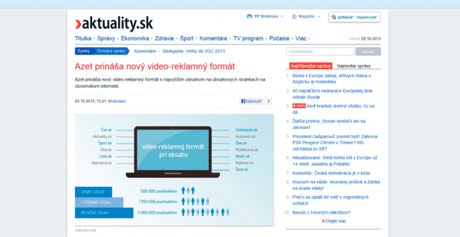 Azet.sk, ako najväčší prevádzkovateľ na Slovenskom internete, prináša niečo nové aj pre svojich inzertných partnerov a klientov. Uvádza na trh novinku – video-reklamný formát, umiestnený na 13-tich obsahových magazínoch s najväčším zásahom na Slovensku pri magazínovom/spravodajskom obsahu.